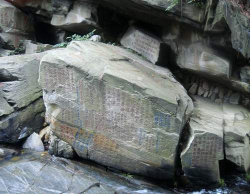 在舒州,让黄庭坚最为醉心的要数“山谷”。“山谷”在天柱山南麓,这里有“畏畏隹隹石谷水”的“山谷流泉”,有“穷幽深而不尽”的“石牛古洞”。山谷的东头即是梁武帝时建的“乾元禅寺”,禅宗三祖僧璨(510-606)曾在此坐禅,故又名“三祖寺”。翻上山谷高阜,东可远眺汉武帝当年封禅拜岳之台,北览司命真源宫祠、应梦井,南望古堰吴塘、诗崖酒岛,人文景致、自然风光尽收眼底。王安石任舒州通判时曾游过石牛古洞,写有著名的六言诗《题舒州山谷寺石牛洞泉穴》题于岩壁: