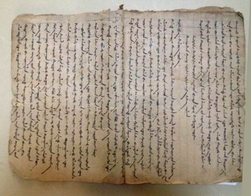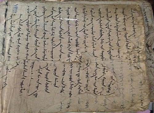 二、以民族文字为中心,个别的说唱底稿中夹杂着汉字词;这是参考或翻译了汉文书籍的写照。例如下图2所示,传统蒙古文字的说唱底稿中夹杂着“吉寿永常,受命于天”几个汉字,这显然是说唱艺人对传国玺“受命于天,既寿永昌”的误写。从近代所发现的说唱底稿中,这种情况比较多见。还有一点是,在搜集到的说唱底稿中,一部分为仿照蒙古文而创造的满文的说唱底稿,其中并无夹杂汉字(如图一)。从现今发现的手写底稿中看,这一点或可以成为满蒙文的说唱底稿区别于传统蒙古文说唱底稿的明显特点。