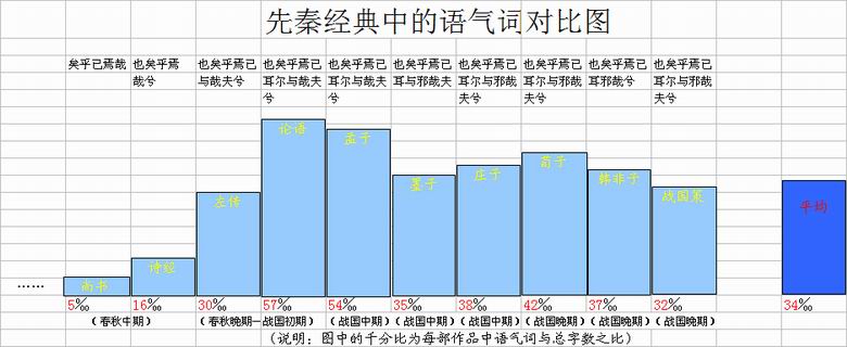 根据此图可以看出,在春秋中期之前的书面语中是没有语气词的,图中以“……”示之。《尚书》中只有三个语气词,一个“乎”字,七个“矣”字,116个个“哉”字[12]。《诗经》中增加到六个,《左传》则上升到九个,《论语》增至十一个。《论语》中的语气词使用次数与字数之比在这几部经典中是最高的,达57‰,也就是在1000个字中就有57个是语气词;《孟子》也有54‰。《论语》号称“语录体”,而《孟子》则是个人创作的书面语著作,语气词的使用居然如此接近,比较奇怪。下面几部经典中的语气词使用量相差不多,在平均量34‰上下。由图表中的高低走向,多少可以看出先秦书面语中语气词的发展轨迹,是从少到多,然后再平稳发展,似乎很符合事物的一般规律。