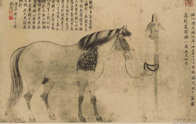 《五马图》李公麟传世佳作,纸本墨笔,纵29.3厘米,横225厘米,无名款。图以白描的手法画了五匹西域进贡给北宋朝廷的骏马,各由一名奚官牵引。每匹马后有宋黄庭坚题字,谓马之年龄、进贡时间、马名、收于何厩等,并跋称为李伯时(公麟)所作。五匹马各具美名,令人遐想,依次为:凤头骢、锦膊骢、好头赤、照夜白、满川花,而五位奚官则前三人为西域装束,后两人为汉人。五匹马体格健壮,虽毛色不一,姿态各异,但显得驯养有素,极其温顺。五个奚官则因身份不同,或骄横,或气盛,或谨慎,或老成,举手投足,无不恰如其分。