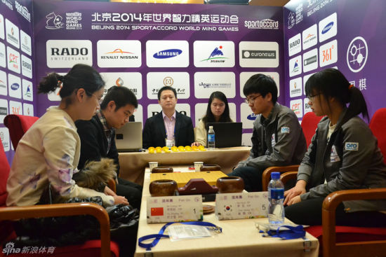 决赛在中韩之间进行,猜先结果韩国罗玄/崔精组合执黑先行。韩国组合选择了最近流行的星、无忧角的开局,随后白棋进右上角,黑棋走得外势。对这个布局中韩的判断有些出入,中国棋手喜欢白棋,韩国人则酷爱黑方,因此开局双方算是各得其所,且心中窃喜。