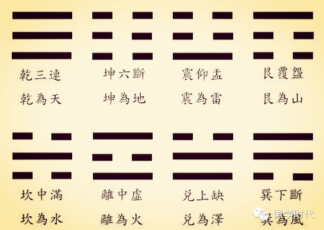 《周易》中八种具有独特象征意义的基本图形,相传由伏羲创制,用来象征天地间八种基本事物,以及各自阴阳刚柔等诸方面的特性。