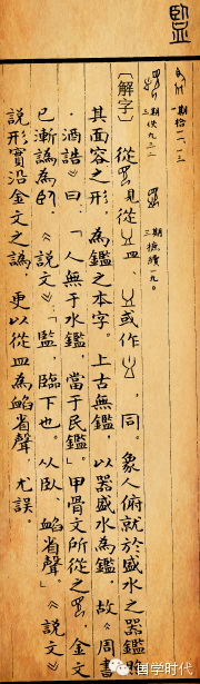 从文字本身而言,甲骨文中“鉴”,象形字,看起来像一个人正对着水盆形状的器物,整理自己的容貌。