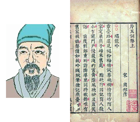 周邦彦(1056-1121)字美成,号清真居士,钱塘(今浙江杭州)人。《宋史·文苑传》说他少时“疏隽少检,为不州里推重,而博涉百家之书”。即是说周邦彦年轻时行为狂放不知道检点,因此当地士大夫不认可他。但他学问很丰富。神宗元丰二年(1079)入京都为太学生,元丰二年,献《汴都赋》六千言,铺陈汴京盛况,赞扬新法,因此由诸生擢为太学正,任教太学。在此期间,辞采斐然、年少风流的周邦彦经常流连于秦楼楚馆、歌台舞榭,所写辞章,大都是应答歌伎的“软媚”之作(张炎《词源》下)据说是在李师师家创作的《少年游·并刀如水》即写于这个时期。
