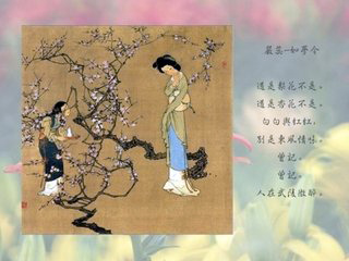 此时台州太守乃是唐与正,字仲友,少年高才,风流文彩。宋时法度,官府有酒,皆召歌妓承应,只站着歌唱送酒,不许私侍寝席。却是与他谑浪狎昵,也算不得许多清处。仲友见严蕊如此十全可喜,尽有眷顾之意,只为官箴拘束,不敢胡为。但是良辰佳节,或宾客席上,必定召他来侑酒。一日,红白桃花盛开,仲友置酒赏玩,严蕊少不得来供应。饮酒中间,仲友晓得他善于诗咏,就将红白桃花为题,命赋小词。严蕊应声成一阕,词云:“道是梨花不是,道是杏花不是。白白与红红,别是东风情味。曾记,曾记,人在武陵微醉。——词寄《如梦令》”。