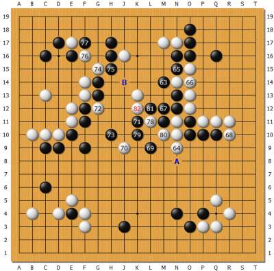 如图至第82手。80和82都是必然的,所以叫78为神之一手。其实AlphaGo这时走B位,据职业棋手分析,空里没有什么棋。如果白M13扑,黑可以 提掉78一子,白L13再打吃,黑粘在78位。下面白吃不掉63这个子。对人来说变化并不复杂。观战棋手猜测李世石预想的变化图是这样的: