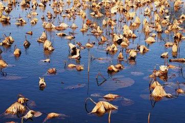 中国古典诗词中,写将秋霜和枯荷连缀在一起的著名诗词至少有两首,一首是晚唐名家李商隐的诗《宿骆氏亭寄怀崔雍崔衮》:“秋阴不散霜飞晚,留得枯荷听雨声”,另一首是南唐中主李璟的词作《摊破浣溪沙》:“菡萏香销翠叶残,西风愁起绿波间,还与韶光共憔悴,不堪看”。如果再加上这只曲【干荷叶】,则分别可作为诗词曲咏歌此景此情的代表,鼎足为三。因为三者各有特色:李商隐的《宿骆氏亭寄怀崔雍崔衮》是写听觉:那单调的不断重复的秋雨“啪嗒”、“啪嗒”声,虽然更增添了离亲别友漂流在外的游子孤独的情怀,但清夜长漏、孤眠独宿中听雨打枯荷,也是一种消磨长夜的办法吧!所以诗人才感谢苍天“留得枯荷”。于是,客中的孤寂和对友人崔雍、崔衮的思念皆从中暗暗流露出来。李璟的《摊破浣溪沙》是写视觉:西风乍起,翠叶凋零。当年是翠叶映衬碧水,现在是翠叶凋残,水自空碧。由此想到韶华渐逝,物是人非,更有种人生的伤感。作为一位偏安于一隅的帝王,恐怕还有国运消歇的深悲。刘秉忠这只【干荷叶】曲则是既写视觉又写听觉,还加上个嗅觉。写视觉,视野下的色彩更具体,也更繁富。李璟词中只说“翠叶残”,刘秉忠曲中则加以具体描绘:“色苍苍”、“越添黄”。苍苍是苍青色;“越添黄”则是在苍青之中又加上黄色,变成了苍黄色,这正是枯荷的颜色。如果再加上“一场霜”,再铺展在“寂寞秋江上”,色彩就更加繁富。试想一下:在凝碧的秋江之上,苍黄色的枯荷一望无际,叶边、茎上又盖上一层寒霜,这是一种何等的苍茫感和寥廓感。再加上风中不断摇晃的“老柄”,似乎能听到风摇枯荷那一片沙沙声,也似乎可以嗅到随着沙沙声传来的淡淡的“清香”。是的,秋江是寂寞的,但有了这不甘寂寞的“老柄”,就凭添了几分生命意识,就凭添了几分顽强和苍劲。它比李商隐诗中那一味地孤独,比李璟词中那一味地衰瑟,似乎多了几分生气,几分健劲。它也是一种索寞,但是一种经过终生拼搏位极人臣后的索寞;它也有几分悲怆,但是一种阅尽人间春色亦“终为土灰”的悲怆。由于身份、阅历、遭遇、秉性的不同。刘秉忠的此曲比李商隐的诗、李璟的词少了几分孱弱、几分颓丧。从这个角度来说,刘秉忠的这首【干荷叶】,与李商隐的《宿骆氏亭寄怀崔雍崔衮》,李璟的《摊破浣溪沙》这两首将秋霜和枯荷连缀在一起的著名诗词鼎足为三,是不为过的