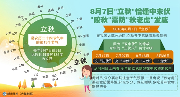在我国大部分地区,立秋并不意味着秋天到来。天文专家指出,因为“双中伏”的缘故,今年的“三伏天”共计40天,7月17日交“初伏”,7月27日交“中伏”,8月16日交“末伏”,8月26日“出伏”。从时间段上来看,今年的立秋刚好在中伏和末伏内。