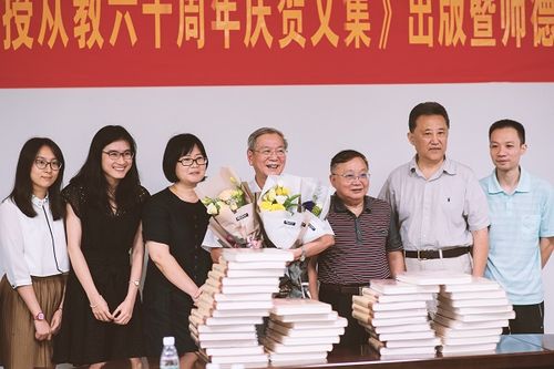 嘉宾交流后,刘斯奋、欧阳光、戚世隽、黎国韬、孙笛庐、郭东璇等六位分别作为60年代、70年代、80年代、90年代、20世纪00年代、10年代的代表向老师献花,合影留念。