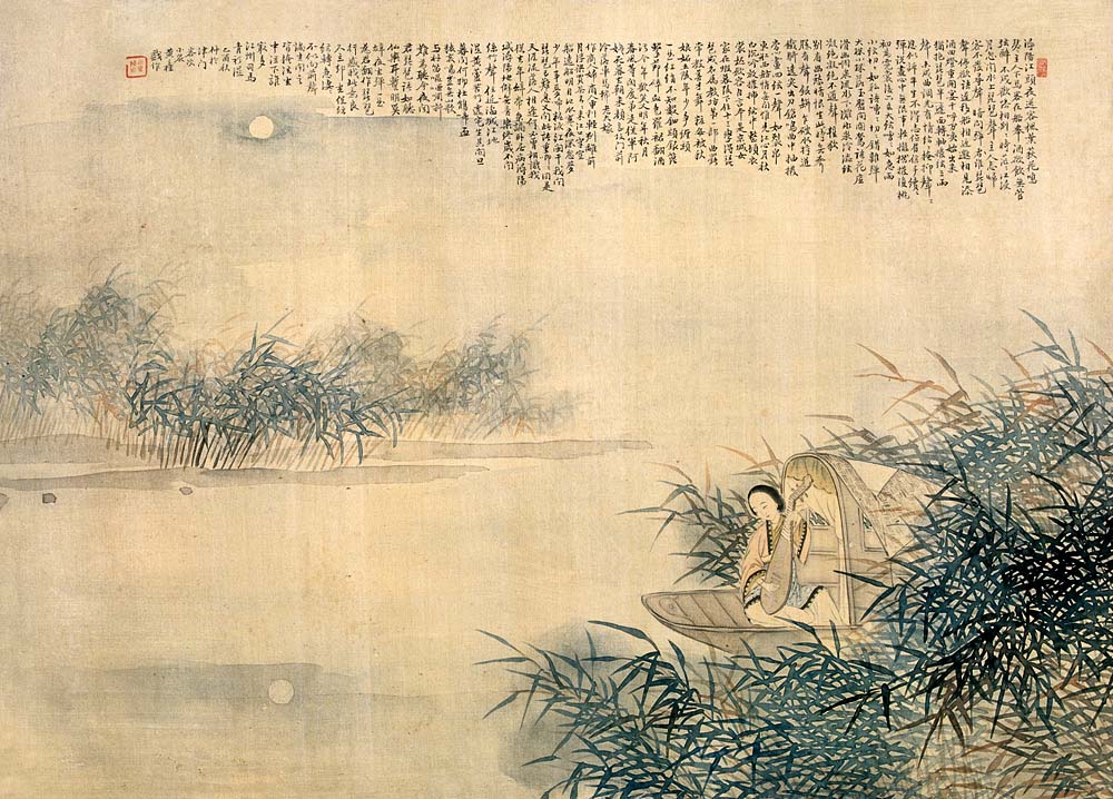 背景之后就是人物出场了。这是位有才有貌的玉堂人物。玉堂,翰林院的雅称。宋太宗淳化年间曾赐匾翰林院,称之为“玉堂之署”。卢挚做过翰林院承旨,所以朱帘秀称他为“玉堂人物”。当然,这不仅是指官衔,更有“才华过人、玉貌堂堂”这类夸许和敬慕之意。但今日,这位才华出众、器宇轩昂玉堂人物却形容憔悴,垂头丧气。为什么?曲作者没有点破原委,因为对方在赠曲中已说得很明白:“痛煞煞好难割舍”。赠曲显而和曲隐,赠曲详则和曲略,这样一唱一和,才显得相得益彰。接着下去的两句“倚篷窗一身儿活受苦,恨不得随大江东去”则是直接表达自己的心境和感受了,在手法上则是紧扣对方的赠曲:卢挚在赠曲中先是化虚为实,说目送情人远去,是“画船儿载将春去也”,将“春”这个抽象的季节特征化为具体的意象以借代情人朱帘秀:要离开他去江南,画船载走的春天,也载走了情人。春的温暖,春的明媚,春的生机和活力,情人的温婉、情人的聪慧、情人的遣绻,都被那只画船儿载走了。“空留下半江明月”则是用象征手法渲染气氛:作者举目四望,斯人已去,只留下了江上冷清清的月影,在近处的波面上瑟瑟晃漾。“半江明月”就像“孤峰月照半江水”一样,除了孤寂感外,还有一种残缺感,它正是作者送别朱帘秀后的残破心灵的反照。借眼前的景语,带有象征的意味。朱帘秀虽是才艺双全,但在曲辞上自然比不上这位玉堂人物,但情感的真挚、离别之苦一点也不逊于对方。只是表达手法改为直白的内心倾诉:“倚篷窗一身儿活受苦,恨不得随大江东去”。这条别船,在卢挚的眼中是“画舫”,在朱帘秀的眼中则是“蓬窗”。这大概是在倾诉别后的处境和心境:离开京都歌伎生活,作为一个贫民女子,今后只能是守着茅屋蓬窗度日了。宋代女词人李清照形容丈夫去世后自己的孤苦凄凉处境时写道:“守著窗儿,独自怎生得黑!梧桐更兼细雨,到黄昏点点滴滴”(《声声慢》)。朱帘秀化用此意,形容自己别后的处境和心境。而且“倚篷窗”比起李清照词中的“守著窗儿”更有着一种居住条件的区隔,也增添了一种空旷疏懒的慵态,这大概也是歌伎与贵族妇女的不同。至于最后一句“恨不得随大江东去”则是直接道出自己的心声,它也是两人离愁别苦达到最浓处的必然结果,卢挚赠曲的结句“空留下半江明月”亦系此意只不过他说得含蓄一点,化用了北宋词人晏几道的“当时明月在,曾照彩云归”(《鹧鸪天》)的词意罢了。