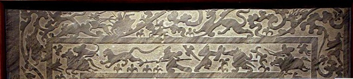 射猎图 此石画面分为两栏,是陕北东汉画像石应用最多的题材之一,为当时贵族有闲阶级的一种娱乐生活。上部刻卷草边饰花纹,间刻人物、神兽拉云车、奔兽等,下部刻有猎虎、捕熊、射羊、遂兔等打猎场面。猎者使用弓、箭、戟、斧和矛、盾等武器,步骑结合,前后夹击,围猎野兽。构图明快活泼,气氛紧张,把各种动物的特点刻画得淋漓尽致,如鹿、兔狂奔逃命,猎犬追逐其间,而虎态凶肆,张牙舞爪,熊则怒而直立与猎者搏斗。形态生动、逼真。