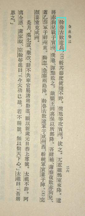 V、《金史》第一册第26页“斡鲁古败辽兵”(见图V01)