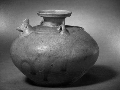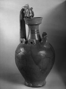 器形更高,口径也相应增大。鸡头高昂前挺,露出胸脯,极象公鸡打鸣状。相对处龙柄连肩,龙头扎进盘口,作饮水状。此一时期代表:河北省博物馆藏的北齐“青釉龙柄鸡首四系壶”为北朝后期北方的典型作品。此器通高44.5厘米,口径10.8厘米,盘口比前朝增高、微侈、长颈、圆肩、鼓腹、平底、颈部中间内束,饰凸弦纹两道,颈腹相交处还有凸弦纹一道,肩部两侧各有一对方形系耳。前有鸡首状流,鸡头变前朝的直挺为弯曲柔和,鸡头锥状无孔,鸡腹侧用线刻划出鸡翅膀,使整个形象栩栩生动。扁平把手,与前期比,龙头雕饰得更繁复,也比前朝大,且富有生趣。整件器物与南方比,更显粗犷(图8)。