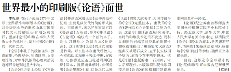 本报讯 在孔子诞辰2573年之际,世界最小印刷版本的《论语》,以钞版纪念券的形式由发行。整部《论语》印刷在半张人民币大小的纸钞上,是对传播《论语》的一次新尝试。