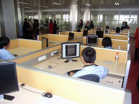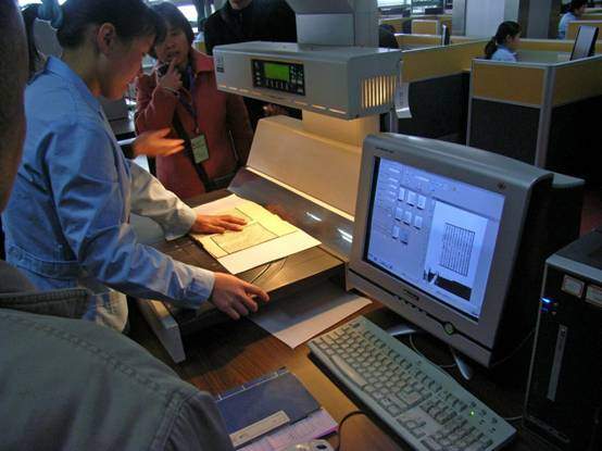 图像版电子古籍可以说与古籍善本缩微胶片以及影印版古籍有相似之处。影印古籍是源于古籍的影写本与覆刻本(或称影刻本、仿刻本),如清末黎庶昌编刻的《古逸丛书》就是十分逼真的覆刻本。而当石印技术、珂罗版技术传入中国后,也就利用这些技术来重印或缩印古籍。如同文书局石印的以武英殿铜活字本爲底本的《古今图书集成》,董康珂罗版印制的《刘梦得文集》,商务印书馆的《续古逸丛书》。而现在则可以先用照相制版或电脑扫描制版再采用胶印或其他印刷方法完成。如中华书局的《古逸丛书三编》。而北京图书馆出版社的《中华再造善本》更是达到了把珍稀的孤本、善本化身千百,妥善保护的境地,使得各省市的读者有幸看到以前终生难见的古籍善本。可以说,目前的古籍影印工作已较成熟,中华书局总编室的《古籍影印释例》就是基本规范。其中对“合格的古籍影印本”有如下要求:“(1)所采用的底本具有一定的学术价值;(2)参校他本作出校勘记;(3)有足以反映当代研究成果的序文(或称前言、出版说明);(4)正文有断句或新式标点;(5)编制有新的目录或索引;(6)附录有相关研究资料。”以此来看,今天的图像版电子古籍仍有不小的差距。目前广为流传的电子版古籍,如武汉大学出版社的光盘图像版《文渊阁四库全书》、超星的网络版《四库存目丛书》,高等学校中英文数字化国际合作计划(CADAL)的网络版《续修四库全书》等等都是具有代表性的大型丛书型电子版古籍,即对现有的纸本影印本古籍加以数字化制作。但事实上无论是电子书标准、底本选择还是数字化制作本身都存在一定问题。就以前述三家为例,其文件格式不同,为了阅读就不得不安装几种不同的阅读器。其他文件格式,包括方正的CEB文件、书生的SEP文件、知网的CAJ文件等等,据说目前国内的电子书文件大约有二十余种,这当然不利于电子书的应用传播。尽管2008年11月,由中国电子工业标准化技术协会联合多家国内软件公司制定的电子文档互联互通接口标准UOML,已被国际开放标准组织OASIS列为正式标准。但目前我们看到的各个利益集团仍然是各行其是,电子书标准的真正统一似乎仍需时日。至于选择底本,这是任何一项古籍整理工作都必须注意的问题,这里就不加论述了,只是希望有关从事古籍电子书工作的单位能首先做好有关的文献摸底与选择工作,而不是随便拿过一本古籍就来“数字化”。数字化古籍的制作是需要专用的工具设备才能更好地完成。2007年笔者在浙江大学图书馆参观CADAL项目工作的时候,对其规模之大,设备之精有深刻印象。下面是当时的两张照片,插在这里以资介绍:第一张是其工作现场,几十位工作人员正在认真工作;第二张是工作人员正在用西门子专业扫描仪调整所扫描古籍的图像。