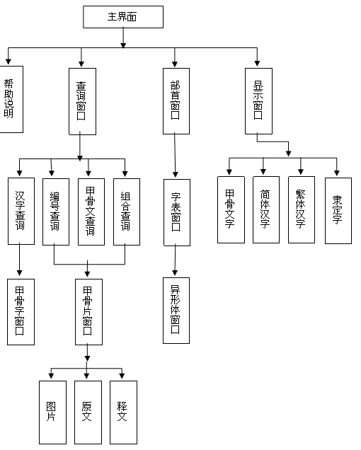 本软件采用ACCESS数据库,字、图、文分别存储在数据库当中。字包括各种甲骨文字和甲骨文字的异形体,以及甲骨文字的简体汉字、繁体汉字及隶定字等。图包括甲骨文拓片及甲骨文拓片的摹本。文包括甲骨片的原文和释文。