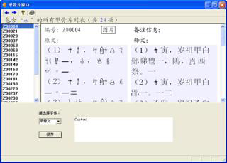 本软件通过扫描《殷墟花园庄东地甲骨》,然后进行裁剪等后期图像处理,建立甲骨文图像库。