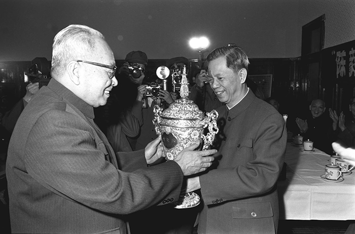 中国围棋协会名誉主席方毅向获得首届“陈毅杯”冠军的海军第一政委叶飞颁奖