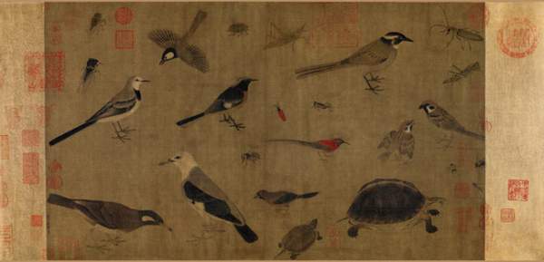写生珍禽图 绢本设色纵41.5cm,横70.8cm,现藏北京故宫博物院。稿本中包括十只不同的鸟、两只龟和12个昆虫,共24只。均以细劲的线条画出轮廓,然后赋以色彩。这些动物造型准确、严谨,特征异常精确工致,极简洁而富有生命感:鸟雀或静立,或展翅,或滑翔,动作各异,生动活泼;昆虫有大有小,小的虽仅似豆粒,却刻划得十分精细,须爪毕现,双翅呈透明状,鲜活如生;两只乌龟是以侧上方俯视的角度进行描绘,前后的透视关系准确精到,显示了作者娴熟的造型能力和精湛的笔墨技巧,描绘方法以墨色为主,运用少量彩色,效果生动。