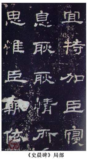 《史晨碑》,碑有两面,故后人分称《史晨前碑》、《史晨后碑》。现藏山东曲阜孔庙。前碑全称《鲁相史晨祀孔子奏铭》或《史晨请出家谷祀孔庙碑》等,刻于东汉灵帝建宁二年(公元169年);后碑全称《鲁相史晨飨孔庙碑》,刻于东汉灵帝建宁元年。清杨守敬《平碑记》说:“昔人谓汉隶不皆佳,而一种古厚之气自不可及,此种是也。”《史晨碑》点划含蓄圆润,结构修饬整密,风格相对朴厚。