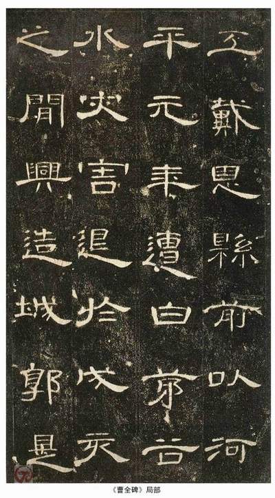 《曹全碑》,全称《汉郃阳令曹全碑》。东汉灵帝中平二年刻(公元185年),现存西安碑林。清张廷济评:“貌如罗绮婵娟,神实铜柯石干。”清杨守敬《平碑记》引孺初说:“分书之有《曹全》,犹真行之有赵董。”《曹全碑》以横为主笔,点划严谨而飘逸,藏露相济,方圆并用,结构注重疏密对比,虽严整而外势极绵长,如长袖舞筵、仙鹤远举,是汉隶的典范之作。