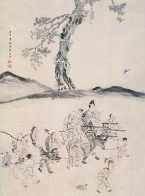 汪家珍的《移居图》(见左图)为纸本设色,纵74.8厘米,横54.8厘米,有“庚申仲冬汪家珍作”书款及“家珍”、“璧人”两方白文印,现藏于浙江省博物馆。该图描绘晋代道士葛洪举家移居罗浮山的典故。葛洪,字稚川,号抱朴子,人称“葛仙翁”,丹阳句容(今江苏省句容县)人。其为三国方士葛玄侄孙,也称“小仙翁”,曾数次为官,被封为伏波将军,南征至广州。其见友人嵇含遭暗杀而隐居罗浮山,拜南海太守鲍靓为师学道习医,并娶鲍靓之女鲍姑为妻;后闻交趾产丹,遂请为句漏令,乃终止于罗浮山,弃官归隐,携家眷跋山涉水绝尘而去,采药炼丹,行医治病,著《抱朴子》等名篇,影响久远。其以老子“道法自然”、“天人合一”等理念为基础,更强调道法、养生、长寿等理论与实践,具有一定的思辨性、学术性、科学性和文学性。其雄辩、文采和才华足以令古今学人仰视,被誉为“东晋道教学者”、“炼丹家”、“医药学家”等。除《神仙传》、《抱朴子》、《肘后备急方》外,其《西京杂记》亦颇为著名。葛洪儒、道双修,如“欲求长生者,必欲积善立功,慈心于物,恕己及人,仁逮昆虫……”(《抱朴子·内篇·微旨》)、“欲求仙者,要当以忠孝和顺仁信为本,若德行不修,而但务方术,皆不得长生也”(《抱朴子·内篇·对俗》),对世人教化比一般方士更具儒家思想。