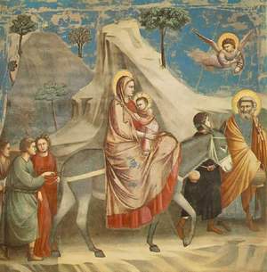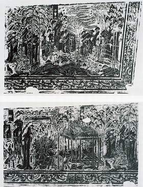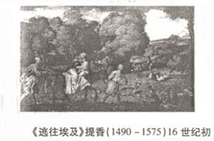 中国北魏时期的石刻作品《孝子棺石棺线刻》(图1)所刻绘孝子故事,刻画山水的形象已表现出很高的水平。画中主要以山水连缀故事,出现了山石树木与人物的比例基本谐调,有一定的空间效果,不再是“人大山小”呆板形式,反映了早期山水题材的面貌。在《佚名》作品《逃往埃及》(图2)年和后来意大利画家提香的作品《逃往埃及》(图3)两篇同名西方画作中,我们可以较清楚地看到西方风景题材一开始也是作为人物活动的背景而出现的,风景只是人物活动的点缀和衬托。这和中国山水画的出现形式的命运基本相似。尚处在: