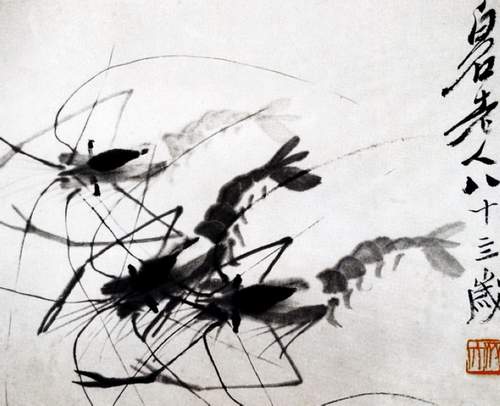 古人认为,作画是“寂寞之道”,须“心境清逸”,以至于“清高孤傲”、“隐居避世”。而齐白石却不然。他出身于农民家庭,性情豪爽,和善可亲,曾经长期云游四方,四海为家。他的作品浑厚苍劲、生辣朴茂,画面灵动而有生气,用笔纵横涂抹,一气呵成,从不计较点画细微处的得失。每一件作品都记录着一次情感的冲动,洋溢着生机勃勃的气息,如《寿酒》的喜庆,《葡萄》的热情,《十里蛙声》的喧闹。鱼虫禽兽自不必说,即使是瓶瓶罐罐、花花草草或青菜萝卜,表面上看是静物,但无论是内容的搭配,色彩的运用,还是笔触的处理,也都呈现了“动”的视觉感受。作品《花卉四条屏》(135.5X49cm)用色浓重而艳丽,红花墨叶,似乎蠢蠢欲动,用笔“状如龙蛇,相钩不断”,用墨酣畅淋漓,令人垂涎欲滴。作品中暗藏着萌动的春意。晚年齐白石更是一改老成和凝重的面目,青春焕发,返老还童。儿童般的好奇,少年般的好动,皆流露于《钓蛙》、《他日相呼》、《草石游虾》、《群虾》、《螃蟹》、《鸡鸭》等大量的作品之中。
