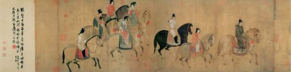 与宗炳同时期的王微,在《叙画》中通过分析书法与绘画的相同之处,而论及山水画的用笔问题,为山水画空间意识的表现注入了新的因素。王微认为“曲以为嵩高,趣(同‘趋’)以为方丈”,作高耸曲折幽深的嵩山时,委曲其笔,以收敛内聚之笔法写之;“方丈”(海中三神山之一)浮于海上,渺茫寒浩,故舒展其笔,写以奔放的笔法;表现高峻挺拔的太华山,当以“发之画”(即草书曲折多变的笔画),表现正面高耸之处,以沉著有力“掣挫安按”的“枉之点”。从王微的这些论述可见,山水画中不同形质的对象、同一对象的向背、俯仰、开合等空间表现,还当以不同的笔势描写,以产生“眉额颊辅,若晏笑兮。孤岩郁秀,若吐云兮。横变纵化,故动生焉”的艺术效果。实现“望秋云,神正扬;临春风,思浩荡”的意境追求,而且这种以形显神,以有通无,“以一管之笔拟太虚之体”的对“神”的追求,与宗炳对“道”的体悟相为映照,使山水画空间意识理论进一步得到完善。我们从展子虔在《游春图》中对画境的追求和具体的空间表现方面不难发现,山水画已由图画山川走向畅神山水,此图中人马屋宇、山石树木比例适称,已不见了《洛神赋图》中人大于山的现象以及山石春松散布着作为人物背景点衬的情形。并且山石树干空勾轮廓,笔势平缓古拙,透出春的气息,辅以青绿赭石泥金托染,山顶小树繁密,树叶组织平板,山的出没、道路的藏显有根有据,远小近大,咫尺千里;春山平湖,碧波荡漾,游骑轻艇,恬然自得;点衬三两成群的士人,盘桓、流连,纵情游乐于春山绿水之间;远处湖山隐若,一派悠然冲和、春光洋溢浑然一体的景象,观此图大有“临春风,思浩荡”之感。