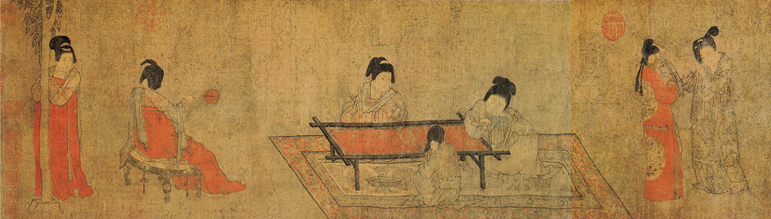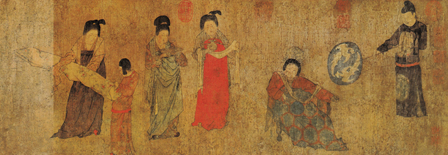 周昉(生卒年不详)是晚唐杰出的人物画家,他笔下的人物非常传神。据载周昉与韩干曾为郭子仪的女婿赵纵画像,一时难分上下,请来赵夫人定夺,赵夫人认为“两者皆似,而韩画得其状貌,昉画能兼得神气情性”。此话在画坛上传为美谈。周昉的仕女画初学张萱,后加以写生变化,笔下人物较张萱更能捕捉深苑闺阁女子的精神状态。