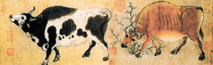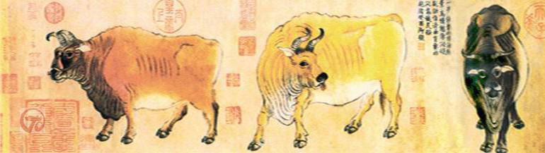 韩滉(723~787),字太冲,长安(今陕西西安)人,为两浙节度使、宰相,唐贞观元年封”晋国公”。他性情耿直,为官清廉,曾任地方官吏,深入山乡,因此笔下田家风俗及牛、羊、驴等走兽神态生动。南宋陆游赞其画,“每见村童牧牛于风林烟草之间,便觉身在图画,起辞官归里之望。”作品有《文苑图》、《田家移居图》、《田家风俗图》等,现仅有《五牛图》传世,此画是迄今中国绘画史上所见最早的纸本真迹,钤有多方收藏印,为流传有绪之作。画中五头不同角度的牛,或低头吃草,或昂头而鸣,缓步慢行,亲切可爱,尽显倔犟而又温顺的性情。画家以细笔绘出牛眼、鼻、口、角,其它则用阔笔粗线勾勒,略施晕染,恰如其分地表现出筋骨和皮毛的质感,显示出了过人的造型能力与笔墨技巧。元人赵孟頫赞叹:“韩晋公五牛图,神气磊落,希世名笔也。”