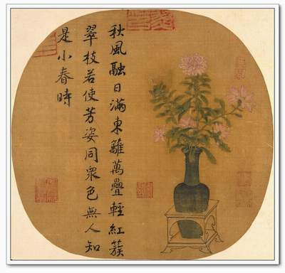 正是在唐宫绘扇蕴然成风的气候下,促进了宋入团扇绘画的勃兴,由上述可知,宋代的团扇画作品能够保存下近百幅的精品也并非偶然,而是有着它深厚的实践基础的。在宋人创作的大量扇画作品中,保存至今的团扇绘画有宋徽宗赵佶的《琵琶山鸟图》,梁楷的《秋柳双鸦图》,夏圭的《松溪泛月图》,林椿的《梅竹寒禽图》,马和之的《月色秋声图》、李嵩的《夜月看潮图》,张茂的《双鸳鸯图》,李东的《雪江卖鱼图》,马麟的《橘绿图》,朱惟德的《江亭揽胜图》以及佚名的《天末归帆图》、《秋江暝泊图》、《群鱼戏藻图》、《豆花蜻蜓图》、《柳溪归牧图》、《长桥卧波图》>>等等。不难看出,这时团扇绘画的范围逐渐由宫廷向民间渗透,其题材涵盖了花鸟、山水、人物等画科,完全是在继承前朝基础上的进一步发展;因为团扇可供的画幅比较狭小,其画法亦十分精细,对比卷轴画而言,有过之而无不及。无疑,这种在团扇上画画的雅习,开了中国小品绘画的先声——对宋代的小品绘画产生了直接的影响,这种影响甚至波及今天——是后来流行的折扇绘画的先导,当之无愧的成为了我国绘画艺术中的一枝奇葩。