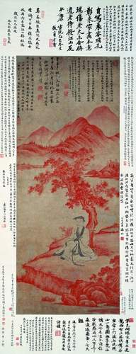 《依朱图》又名《朱色自画像》,画中他抱膝而坐,背倚靠着一株大树。肖像部分全用墨笔白描钩出,不用色彩,而大树及远处的山峦,则全用朱色。他借用“朱”和红色,象征朱元璋开创的大明王朝,表示自己永远是明王朝的人。在落款当中,还特别写上自己是“江南在野臣”。还题有两首七言律诗。其一曰:“剩水残山色尚朱,天昏地黑影微躯。赤心焰起涂丹雘,渴笔言轻愧画图。人物寥寥谁可貌?谷云杳杳亦如愚。翻然自笑三招隐,孰信狂夫早与俱”。诗中不但表白自己借“画图”来倾吐对明王朝的忠诚,而且对江南抗清力量抱有希望:“剩水残山色尚朱”。1644年明王朝覆亡后,清军进关占据北京,次年农历五月,清军渡过长江进入南京。同年农历的闰六月,清军攻陷嘉兴府城,明蓟僚守备项圣谟的堂兄不愿降清,带着自己的两个儿子和妾跳水自杀。项圣谟家亦遭掠劫,所藏历代名画典籍,半为践踏,半为灰烬,项圣谟自己则逃到浙江桐江避难。了解到这一背景,不但使我们清楚地知道项圣谟在此时创作《大树风号图》及题诗中,何以表现出如此沉郁、孤寂、悲怆的情怀。从中亦看出他对明王朝灭亡是如何的伤感及他对明王朝忠诚不二的心迹。