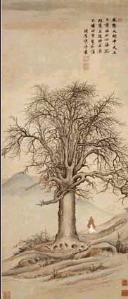 图中背景为一抹苍茫空蒙的远山,山峦逶迤跌宕,荆棘杂草丛生。近处陂陀上古树一株,参天独立,主干粗壮挺直,有刚强不屈之势,枝条繁密横生,蟠曲虬劲,虽树叶尽脱,却显得气势非凡。喻国家虽历风雨,枝干仍傲然挺立。树下一老人携杖背向而立,面容清俊,遥望远山和余晖,徘徊沉吟,似有满腔心事。传达出一种沉穆、凝重、悲愤、孤寂和苍凉的气氛。图右上作者自题七言绝句一首:“风号大树中天立,日薄西山四海孤。短策且随同旦莫(同暮),不堪回首望菰蒲。直接抒发孽子孤臣在国破家亡之际的满腔悲愤。