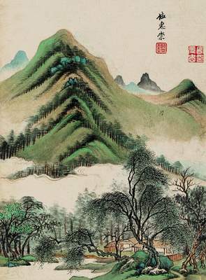 仿大痴山水轴纸本、设色、纵115厘米,横72.5厘米,现藏北京故宫博物院。