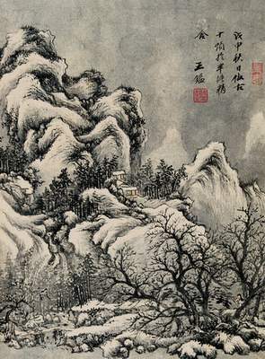 3、王鉴(1598年—1677年),字玄照,后避清圣祖康熙玄烨的名讳,改字元照,圆照,号湘碧,染香庵主,江苏太仓人。曾祖父王世贞是著名文人,鉴藏家和显宦,官至南京刑部尚书,与李攀龙等并称“后七子”,为文坛盟主;富收藏,尔雅楼中藏书万卷,书画文物无数。父王士骥,万历十七年(1589年)进士,官吏部员外郎。王鉴出身于这样一个文学世家和官宦门第,自幼即受到良好的文化教养和艺术熏陶,他自述“缔岁即好点染”,“自幼习董熟耳”,表明他自幼喜爱绘画并是从学南宋董源入手的。以后又追踪巨然和元四家,二十岁(1617)时的《仿云林山水轴》和二十四岁(1621)拟巨然的《山水图》,可证其最早的画学渊薮。王鉴于崇祯六年(1633年)三十六岁时中举人,三十八岁以祖荫任左府都事,进而出仕广东廉州太守,故世称“王廉州”。在任期间,他力罢开矿恶政却险遭牢狱杀身之祸,二年后即罢归。故四十岁其仕宦生活即告终止,与王时敏相仿。其间,他亦倾心于绘画,如自述所言:“余生平无所嗜好,惟于丹青不能忘情。”他以子侄辈与年长六岁的王时敏相交,故早年画法甚受时敏影响。三十九岁(1636年) 结识董其昌,董绘画理论和创作实践对王鉴产生了深刻的影响。其时,王鉴还与杨文驰、程嘉燧、张学曾、卞文瑜、邵弥、李流芳等文人画家来往,吴伟业曾作《画中九友歌》以赞诸人之交谊和画艺。四十岁罢归后,王鉴即专心于绘事,画名远布四方。如四十岁(1637)夏所作《秋山图轴》,王时敏题跋中即云:“玄照画道独步海内,展作纷纷,不无鱼目混珠之叹。”四十一岁(1638年)所作《仿黄公望山水轴》,王时敏又题曰:“玄照此图,丘壑位置深得梅道人三昧,而级法出入董、巨。……当今画家不得不推为第一。展现不觉下拜,遂欲焚砚矣。”王时敏在董公谢世后已成为画坛领袖,他却对王鉴赞赏有加,可想见王鉴当时的盛誉。事实上,王鉴归里后四十年内,由于主客观条件的不同,确实较之王时敏在画艺上更加专志潜心和勤奋刻苦,在艺术功力上亦更胜一筹。王时敏之子王撰在比较其父与王鉴的生活景况时就说:“先世以世务牵制,晚年愁冗纷集,兼多向平之累,兴会所至,时一渲染,未逞朝夕从事于斯。而湘翁则萧然一身,屏去崖事,得以余力专意盘稽。”指出王时敏因家务繁冗,生有八子数女,婚嫁负担沉重,故无暇朝夕作一间,而王鉴妻子早逝,也未续娶,可能亦无儿女,虽晚景孤寂,却能全身心投入艺事,这无疑是很不相同的两种客观环境和条件。其次,两人的思想状态似乎也有所区别,明亡后二王都选择了明哲保身、退隐林下的道路,既不当抗清复明的志士,也不属入仕新朝的武臣,而成为以画自遣的遗民画家。但是,王时敏入清有“出城迎降”之举,内心常自嘲自责:“偷生称隐逸,惭愧北山灵。”王鉴则无此明显失节行为,呈正常的遗民心态,如吴伟业赠诗所曰:“布衣懒自入侯门,手迹流传姓氏存。闻道相公谈翰墨,向人欲仿赵王孙。”