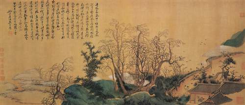 王士祯放鹇图 绢本、设色,纵26.1厘米,横110.7厘米,现藏北京故宫博物院。