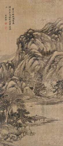 《仿子久山水》为其绫本水墨山水,这在王原祁作品中甚为少见。款识为:“庚辰清和,仿黄子久似瑶老年道翁。王原祁”。钤印:埽花庵(朱)王原祁印(白)茂京父(朱白)。