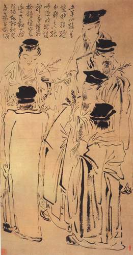 苏长春笔下的仙道人物,其形象塑造并无仙风道骨,乘云驾雾之类特殊本领,往往与常生活中的普通人相类。画中六位手拿穗谷的神仙即是如此。此图全用焦墨写意,逸笔草草,却风致宛然。人物头像似不经意,却刻画出人物各自不同的面貌和神态。