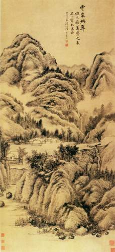 此图作于咸丰五年(1855)清明节,时五十五岁,属晚年精品。画面上远处山峦起伏,树林茂盛,行云浮动于山间。山泉在云岚下汇成小溪,匝谷而下。近处水波涟漪,岩头杂草横生,密林茂繁。在远近之间的空地处有几所小小房屋,参差于谷中平坦处,隐见小院主人正忙於窗前。