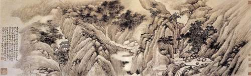 此图作于道光二十七年(1847),时年四十七岁,为戴熙盛年代表之作,也是他“师造化”的最好例证。此图颇有北宋山水的气势,在意境上突破了“四王派”末流的萧淡枯寂,表现得雄浑沉厚。构图上严谨浑厚,树石水墨轻淡,皴擦浑厚。云烟弥漫,气象苍茫。山坳间深藏读书屋舍,意境幽深;其间泉水流泻入潭,安静中亦寓动感。
