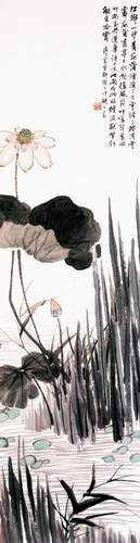 此画构图奇绝,以下半幅之墨叶白荷与上半幅之碧荷红莲相对比,又以红蓼、浮萍将全画统一协调。荷叶以湿笔写出,墨彩淋漓,线条洗练流畅。设色淡雅,却有气势磅礴之感。笔力奔放雄健,如天马行空,有徐渭、陈淳的风骨。款识:“高士有洁癖,美人无冶容。抚白阳山人大意。蒲华。”