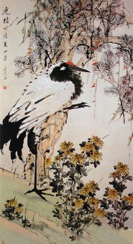 顾鹤逸曾称虚谷作画“清而不枯,密而不乱”。这一幅梅鹤图就充分体现了虚谷的用笔特点。梅树始以湿笔淡墨写出,后以干笔复加勾点,线条断续顿挫,笔段而气连苍劲而松绣形成清虚的韵味。梅花以圆笔勾画,瓣似珠玉,稚拙古朴。鹤用笔极简用浓墨写头尾羽。画面设色清淡,鹤顶却以朱红重色点醒,使整幅画冷俊之中又富变化,质朴而又耐人寻味。