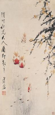梅花金鱼图 立轴 、设色、纸本,纵107厘米,横45.4c厘米。
