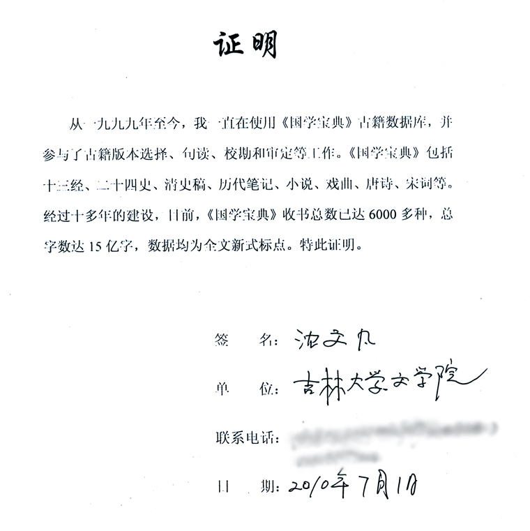 从一九九九年至今,我一直在使用《》古籍数据库,并参与了古籍版本选择、句读、校勘和审定等工作。《》包括十三经、二十四史、清史稿、历代笔记、小说、戏曲、唐诗、宋词等。经过十多年的建设,目前,《》收书总数已达6000多种,总字数达15亿字,数据均为全文新式标点。特此证明。