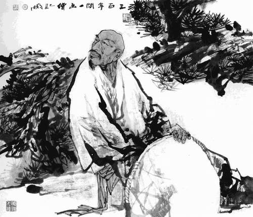 从表面上看,在四位画僧中,渐江要算是一个出家后与前世脱离得最彻底的人了。他不像八大山人那样出家后仍然悲愤难抑,也不像石涛那样身为世外人却热衷于社会的交往联络。他出家后每日挂瓢曳杖,芒鞋羁旅,或长日静坐空潭,或月夜孤啸危岫,俨然是一个“不食人间烟火”、“丝毫世不相关”的世外高人了,他曾有“偶将笔墨落人间,绮丽亭台乱后删,花草吴宫皆不问,独余残沉写钟山”的诗句,表达了他对故国的怀念之情,但又不得已,只好寄兴于自然,云游各地。其画山水,简淡高古,深得山水性情。