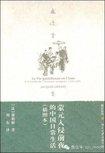 《蒙元入侵前夜的中国日常生活》,法国谢和耐作品。我当时读这本书的时候真是一边大惊失色,一边击节赞叹。谢和耐还原了南宋晚期是整个社会的日常生活细节,包括了城市、市集、官员、婚姻等等。如果你仔细研究的话,就会发现今天中国人的生活与那个时候并无太大的区别。一本伟大的历史著作,会让你清晰认识今天的自己,不菲薄,不自大。北京大学出版社