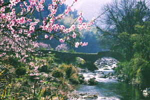今日游桃花源在桃花山下牌坊下车。牌坊两边柱上嵌有“红树青山斜阳古道,桃花流水福地洞天”对联一副,概括了这里的主要景致,也暗示此处与《桃花源记》的关联。过牌坊,即是桃花山流下的桃花溪。溪边有“水源亭”、“渔人停缆”“穷林桥”等古迹,右侧便是一遍桃林。阳春三月,灼灼其华。千树万树,如锦似霞醉。从“水源亭”往上,过“渔人从入处”就达“桃源洞口”,当然,“洞外仙境”仅是想象而已。不过,湖南桃源,与《桃花源记》中的描述,相似之处还是很多的。