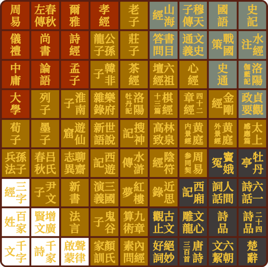 《国学备览》是一套中等规模的国学经典丛书,我们定位为“每个中国人都应该了解的81种经典”。国学九宫格将中国文化史上最具代表性的81种经典放入9×9的方格中,每格一书,方正整齐,名曰“国学九宫格”。九宫格分为五个区位,分别对应传统文献的经(红色)、史(蓝色)、子(黄色)、集(黑色)四部,另新增蒙学(白色)一类,共为五类,对应五行(金、木、水、火、土)和五方(东、南、西、北、中),分类清晰,布局合理,可以作为学习传统文化的入门捷径。