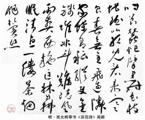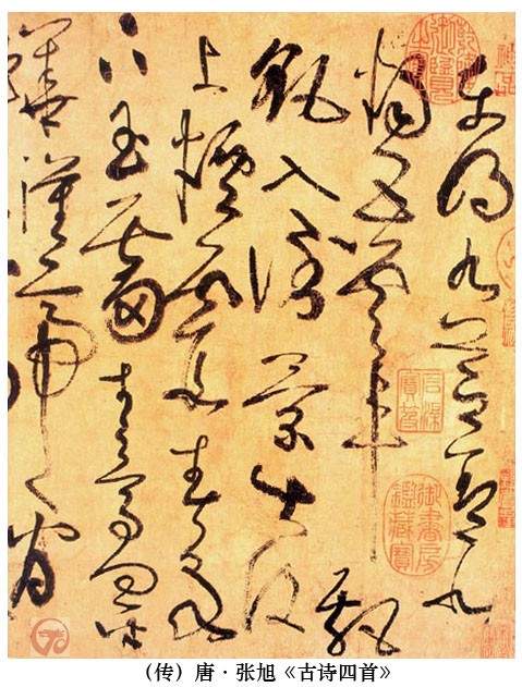 在汉字书法中,草书给人的动感最为强烈。萧衍《草书状》说草书“有飞走流注之势”,宋曹说:“草书贵通畅。……种种笔法,如人坐卧、行立、奔趋、揖让、歌舞、擘踊、醉狂、颠伏,各尽意态,方为有得。”唐代著名草书家张旭,曾经观看舞者公孙大娘表演剑器舞,因而得悟草书的精意,杜甫有诗赞述此事,在书法史上传为佳话;又传闻他曾经见到公主和担夫争道,由彼此之间的动势而领会草书的要诀。因此,在后来的艺术家心目中,张旭的书法,已经充分表现了天地间各种事物的运动本质,故韩愈赞誉他说:“旭之书,变动犹鬼神,不可端倪。”